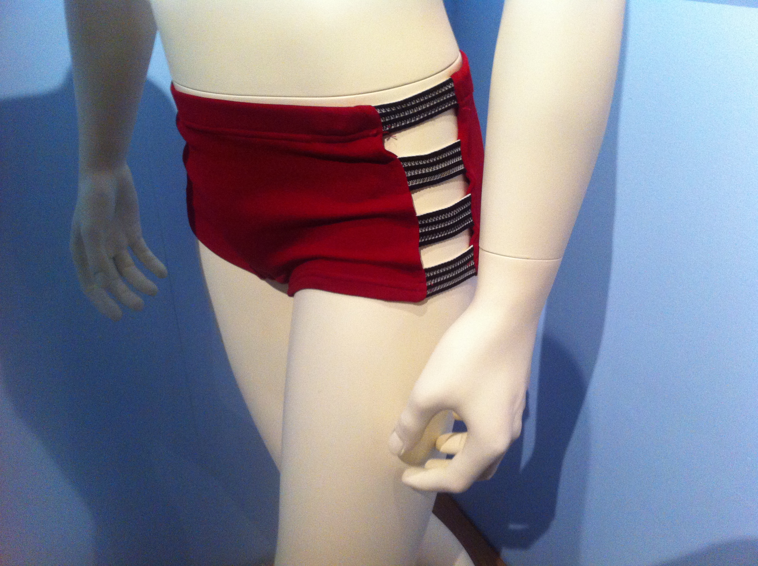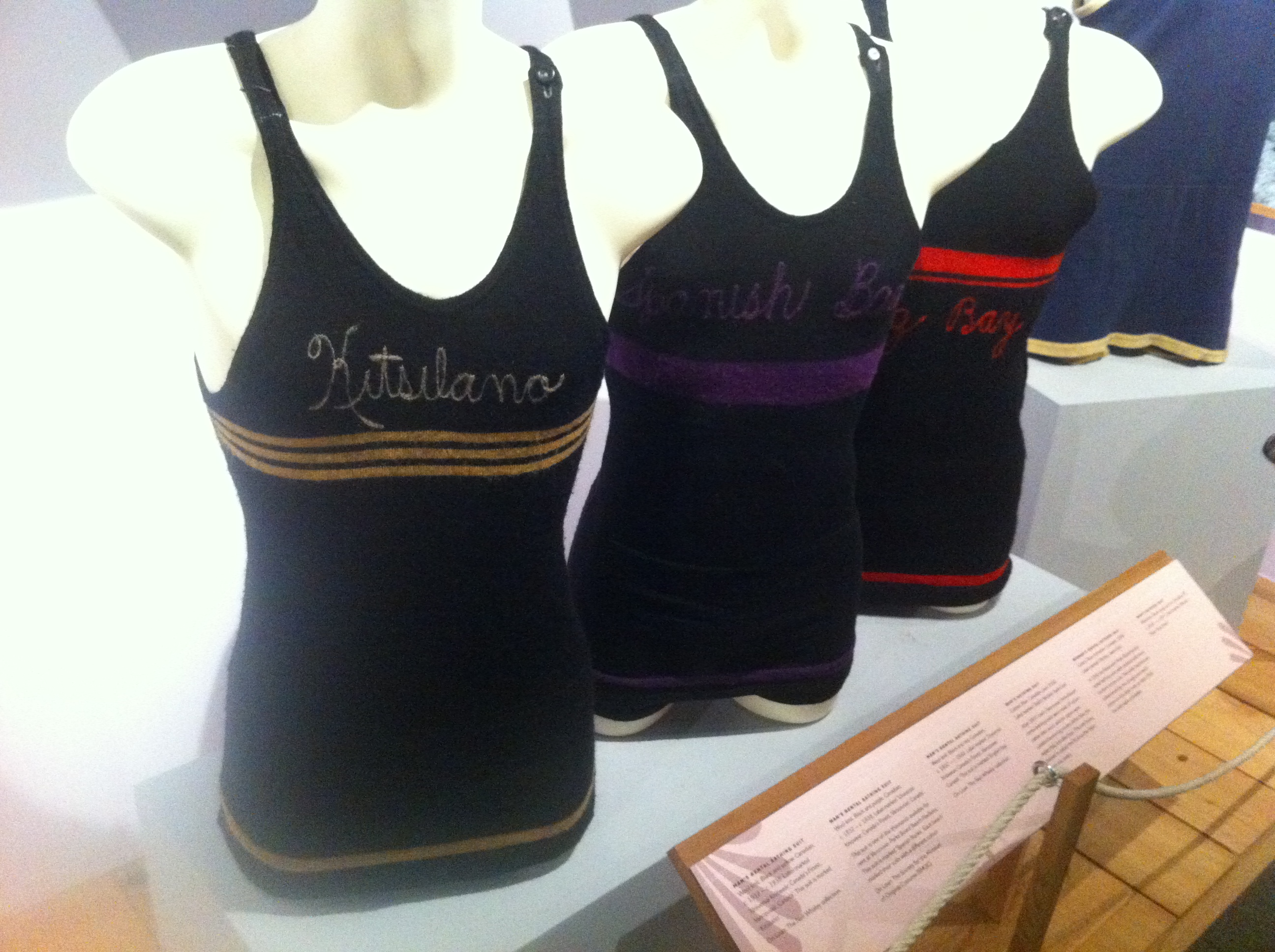 These questions occurred to me when I visited the Vancouver Maritime Museum’s recent exhibition, “Babes and Bathers: History of the Swimsuit”. As others have described, the show featured 60+ pieces of swimwear, most provided by Ivan Sayers, a local fashion historian. The suits ranged from the relatively reserved wool suits of the 1890s to the somewhat saucy numbers of the later 20th century, including my favourite maroon number: