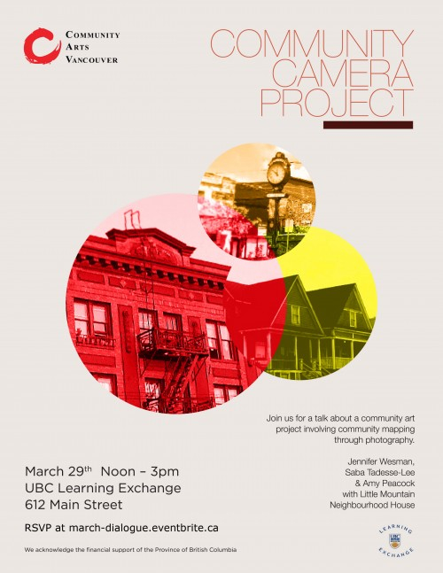 Join Community Arts Vancouver to discuss an exciting community art project involving community mapping through photography. Facilitated by Jennifer Wesman, Saba Tadesse-Lee & Amy Peacock from Little Mountain Neighbourhood House.