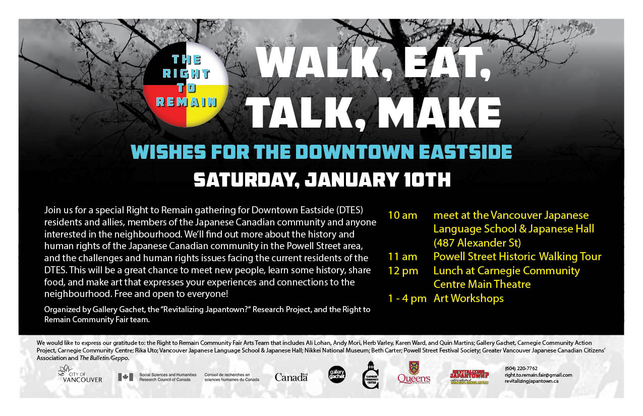 Join the Right to Remain Crew for a special Right to Remain gathering for Downtown Eastside (DTES) residents and allies, members of the Japanese Canadian community and anyone interested in the neighbourhood. You’ll find out more about the history and human rights of the Japanese Canadian community in the Powell Street area, and the challenges and human rights issues facing the current residents of the DTES. The event includes a Powell Street historic walking tour, lunch at the Carnegie Community Centre Main Theatre and art workshops. This will be a great chance to meet new people, learn some history, share food, and make art that expresses your experiences and connections to the neighbourhood.